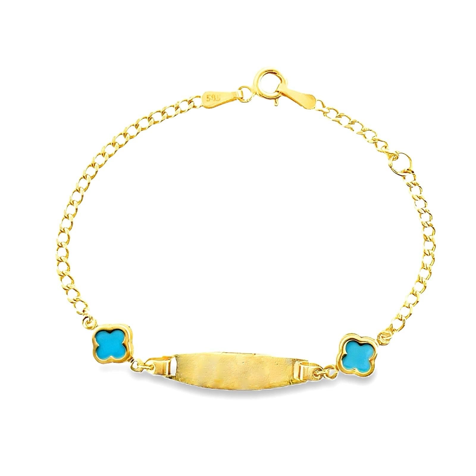 This delicate 14k gold bracelet stands out with its elegant and personalized design. At the center, a polished nameplate engraved with your name adds a unique and meaningful touch. On either side, small turquoise enamel floral accents bring a youthful and sophisticated charm. The fine chain with a spring ring clasp ensures a comfortable and secure fit. Perfect as a thoughtful gift or for everyday wear, this bracelet blends simplicity and style with a vibrant pop of color.