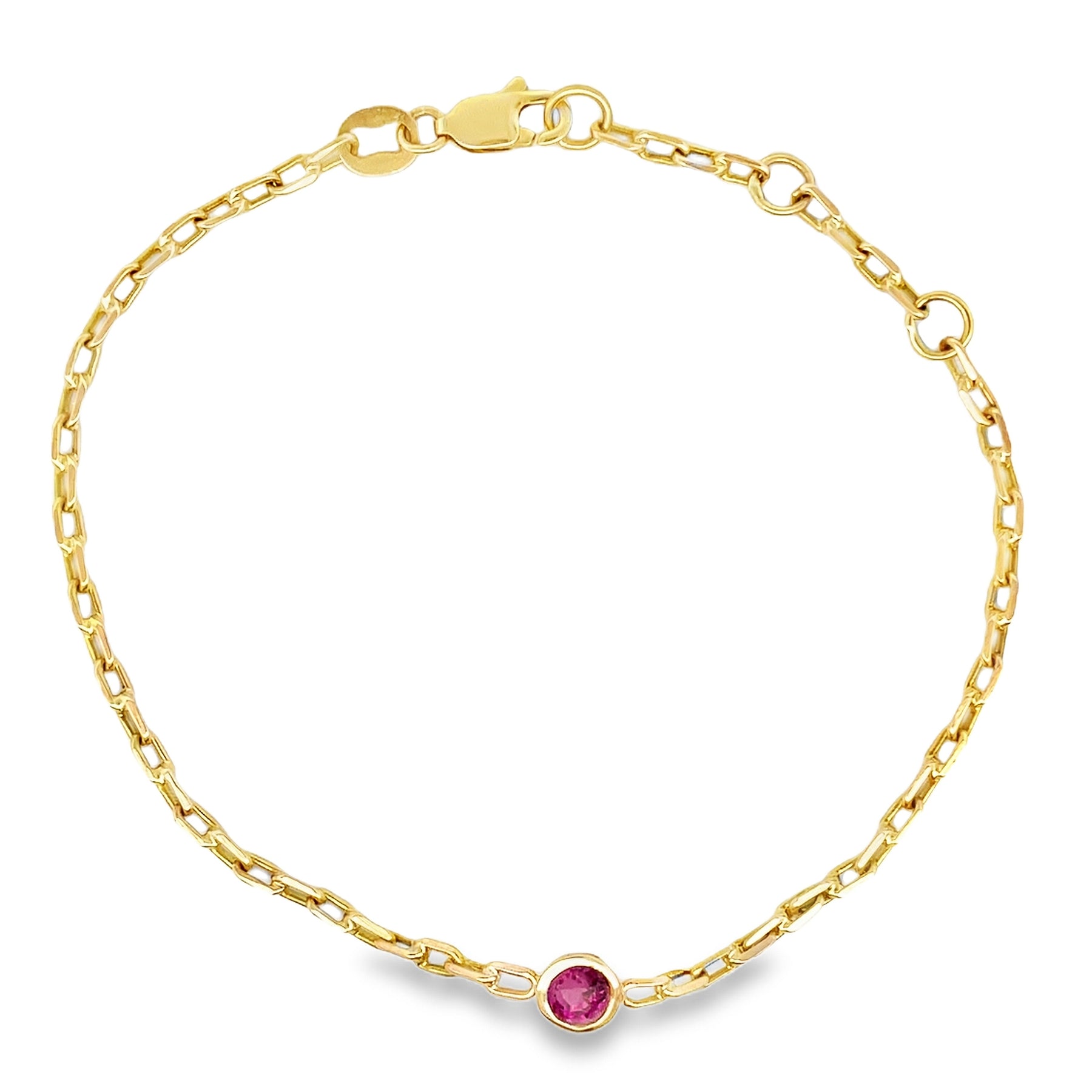 This bracelet is a gorgeous everyday piece featuring a mini link chain and dazzling Ruby centerpiece.