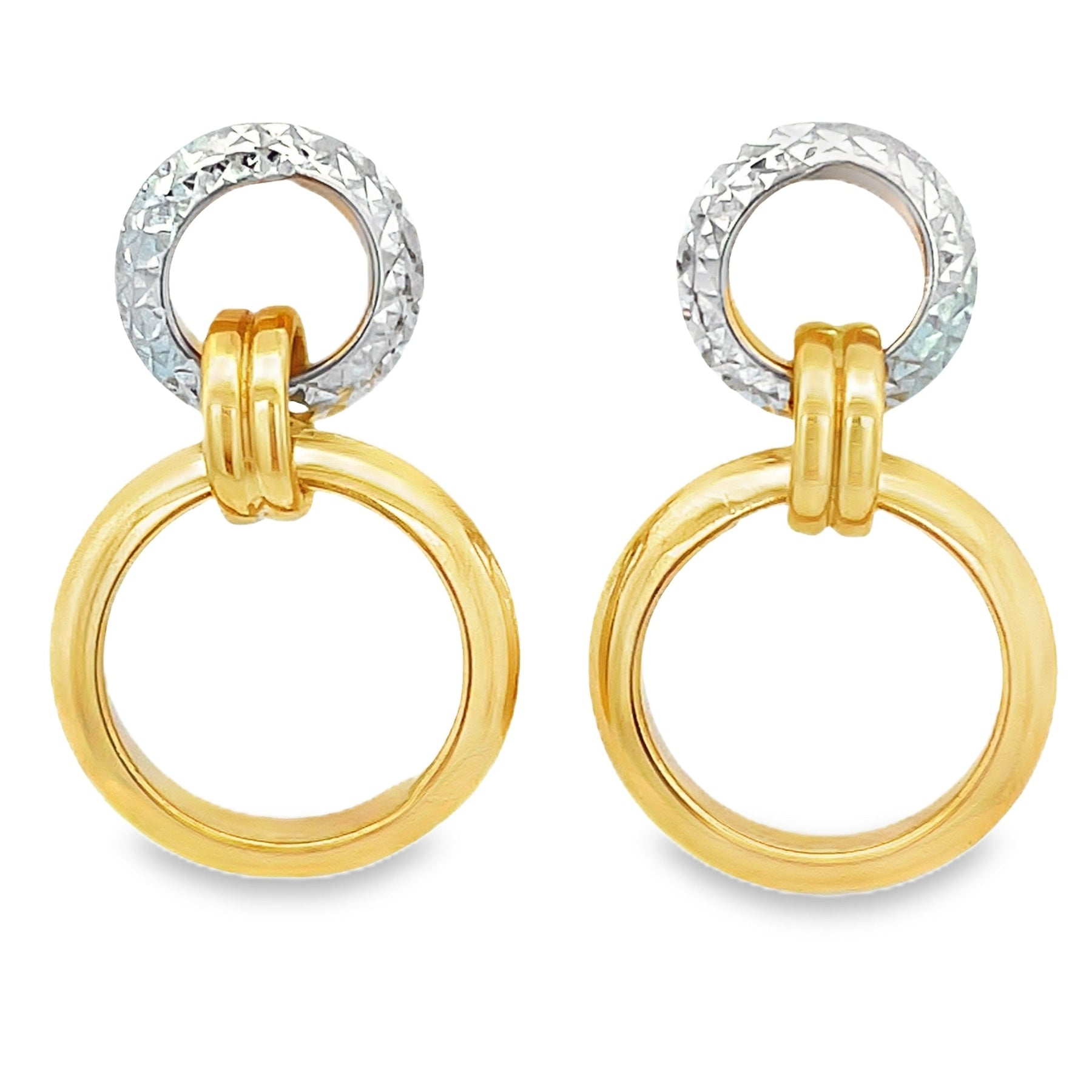 Modern design combining a large smooth yellow gold hoop with a smaller textured white gold upper hoop. Elegant and versatile contrast.