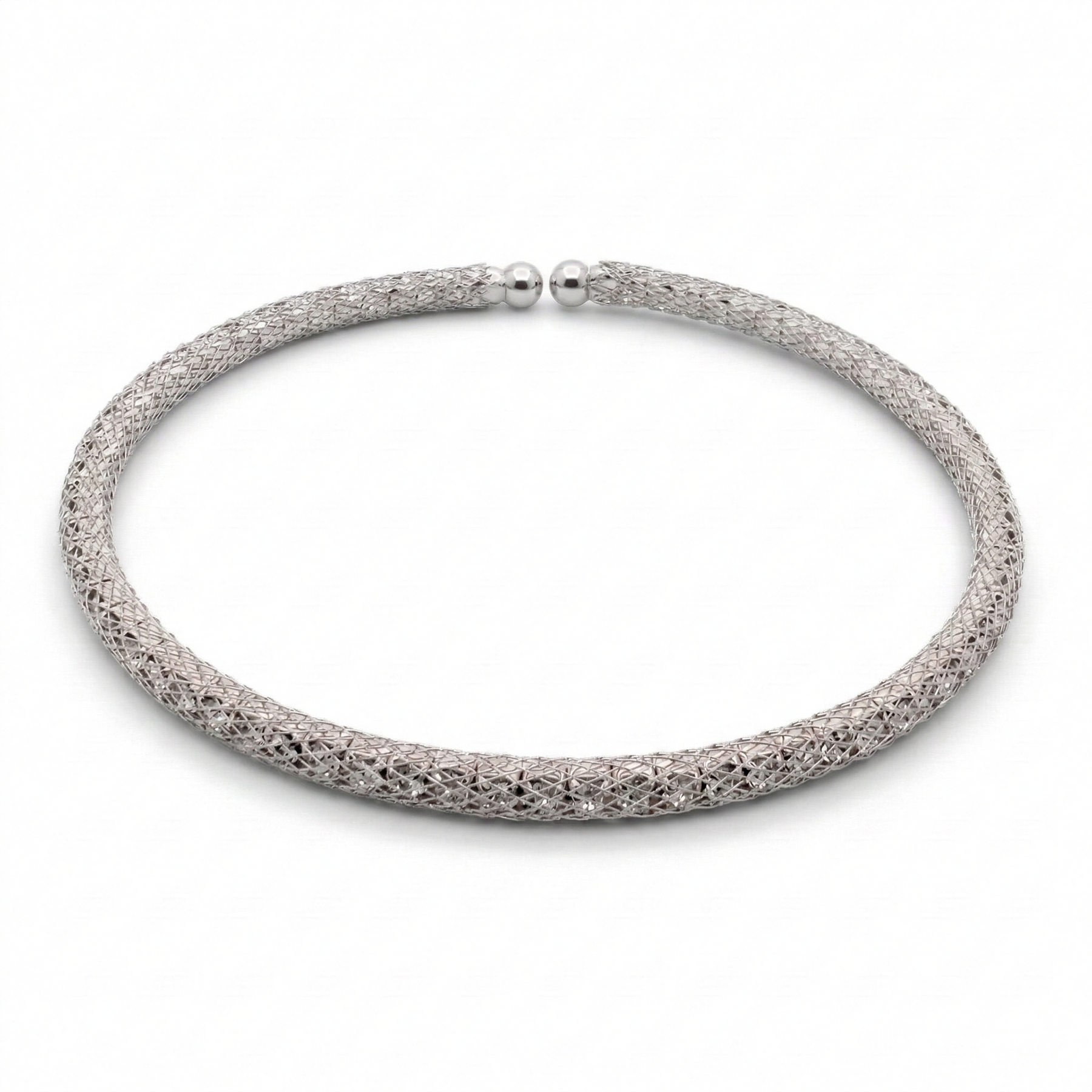 A masterclass in modern texture. This elegant open bangle features an intricate metallic mesh that beautifully diffuses the sparkle of hidden crystals within. Designed with a flexible, adjustable silhouette, it slips onto the wrist with effortless grace. A tactile and radiant statement perfect for both daytime stacking and evening elegance.