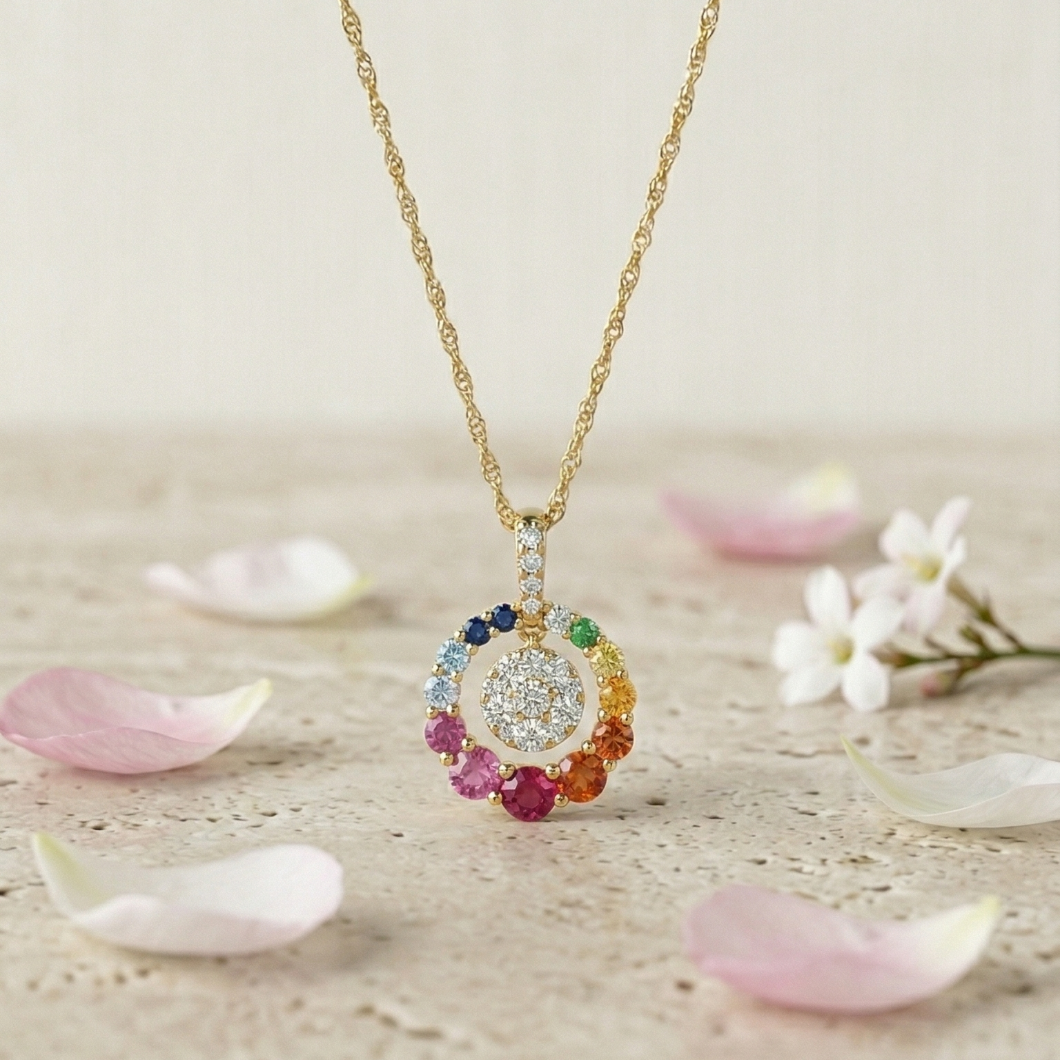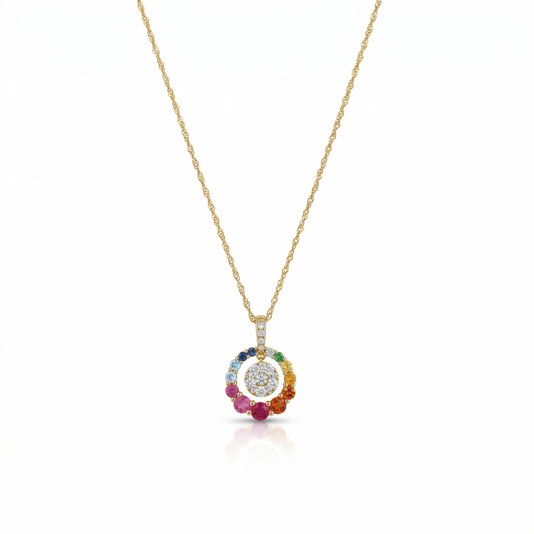 A vibrant circle of color surrounds a luminous diamond center, creating a radiant harmony of brilliance and joy. Playful yet refined, this piece brings a modern expression of elegance to every look.