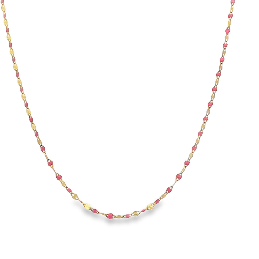 What better way is there to brighten up your everyday look than with this fun pink enamel and gold necklace!